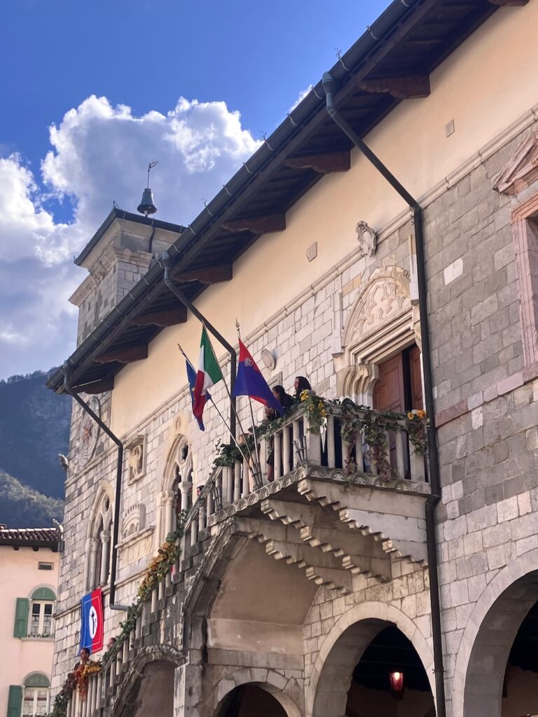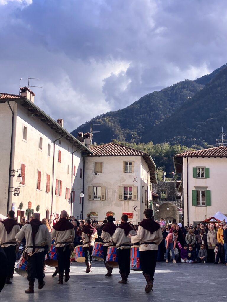 Venzone’s townspeople are already waiting at the platform. Flags flutter, swords clash, and drums thunder. Now, the festival has begun. You follow the parade from the station toward the medieval city gates.
