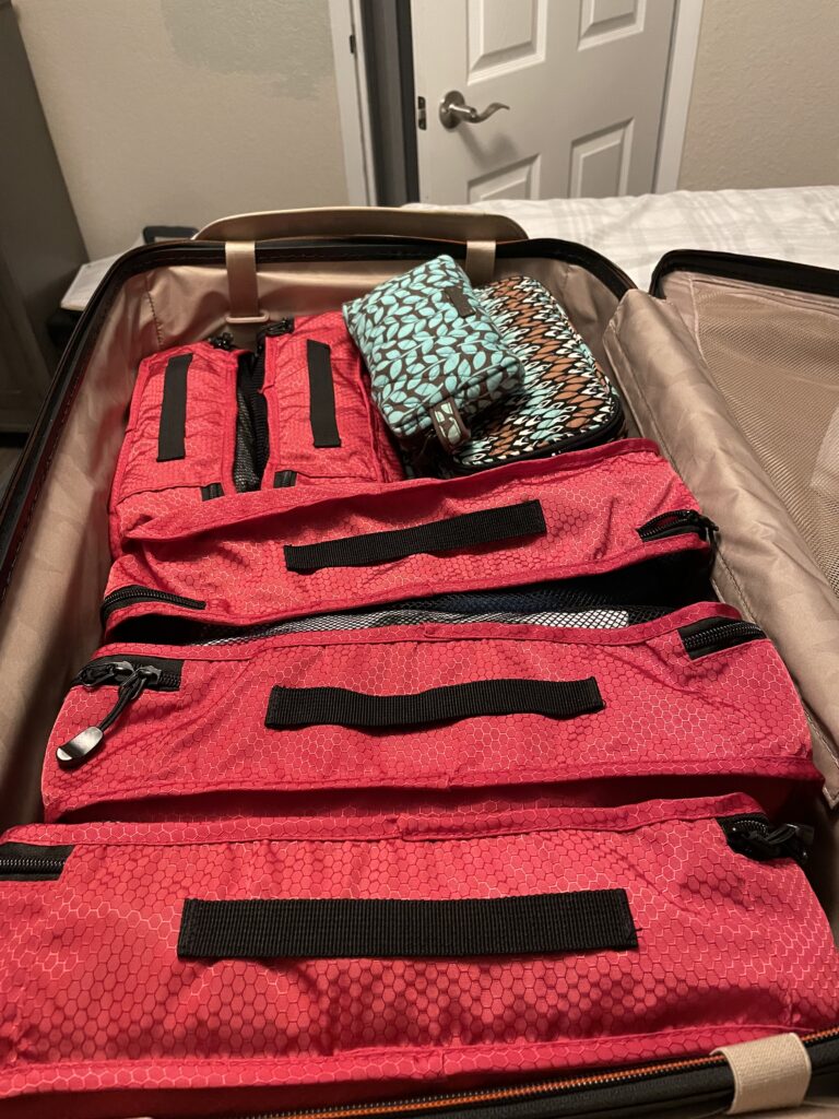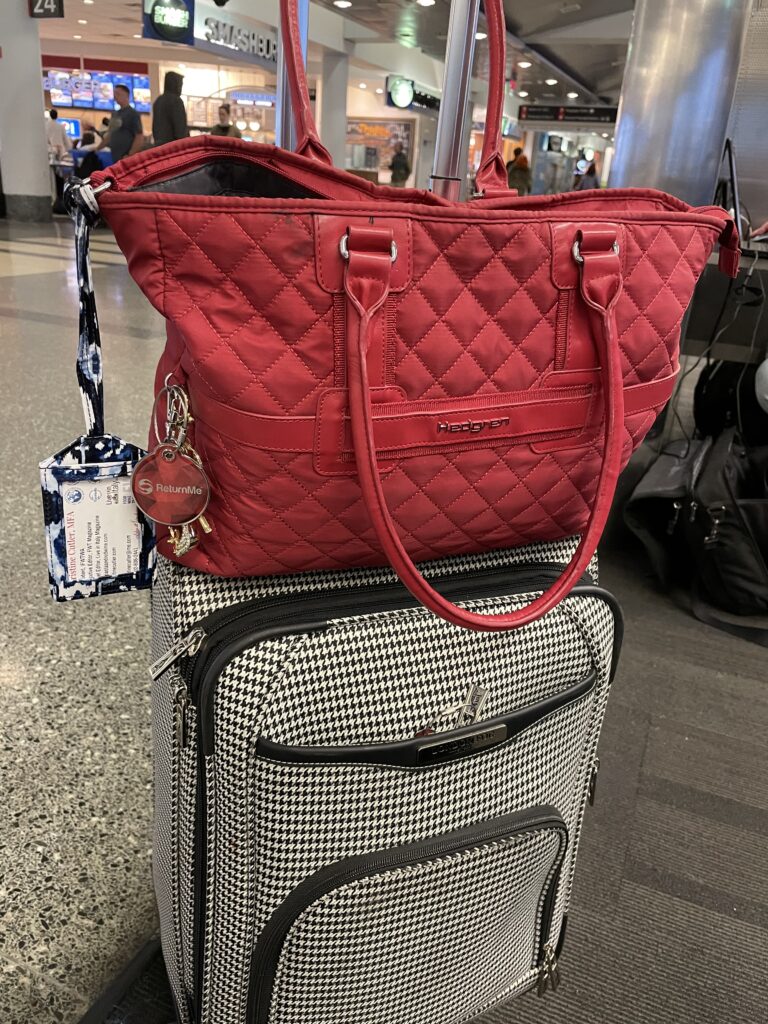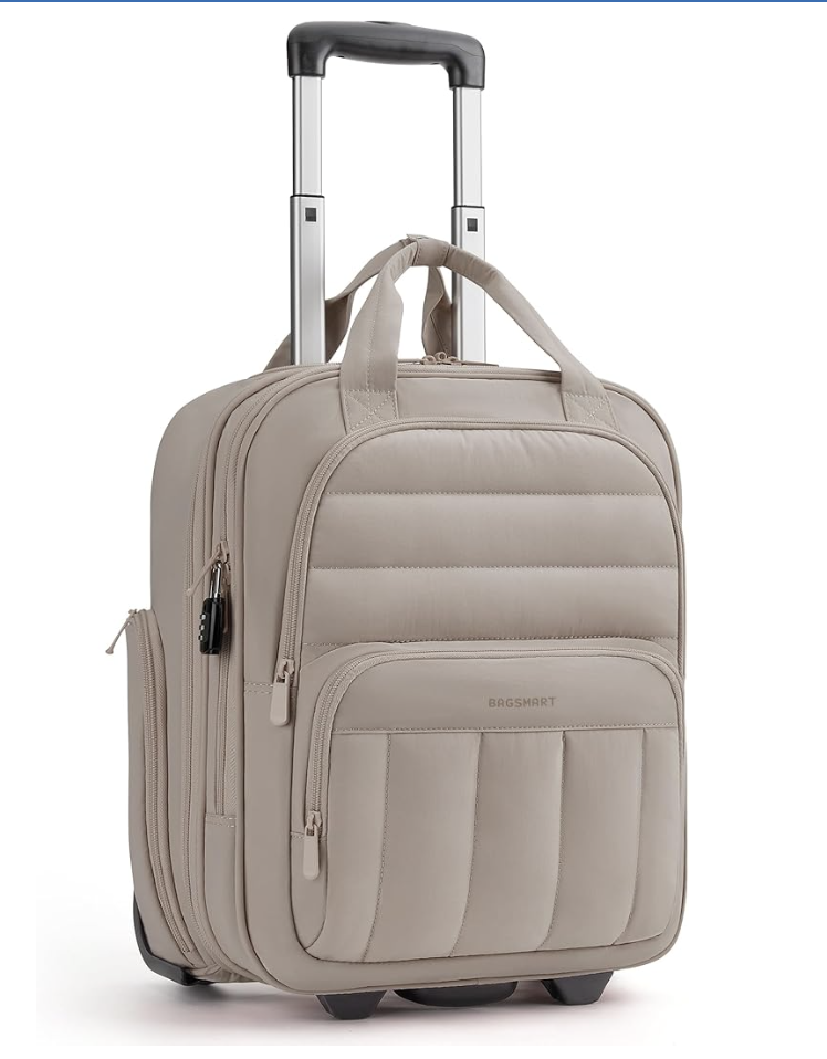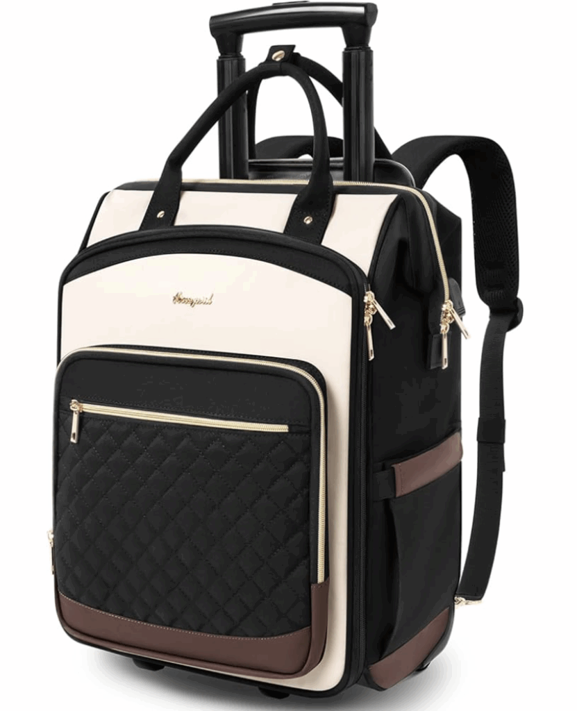 I bought a 15-inch Bagsmart backpack last year, and it performed well. My only complaint (other than I shouldn’t have bought pink since it gets dirty) is that it was too small. During Black Friday sales, I ordered an Arcoyard 18-inch dual-opening rolling backpack. It is a little taller, wider, and deeper, so it should hold everything without my having to smash it in there. I’ll report back.