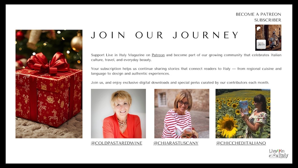 Support Live in Italy Magazine on Patreon and become part of our growing community celebrating Italian culture, travel, and everyday beauty. Your subscription helps us continue sharing stories that connect readers to Italy — from regional cuisine and language to design and authentic experiences.